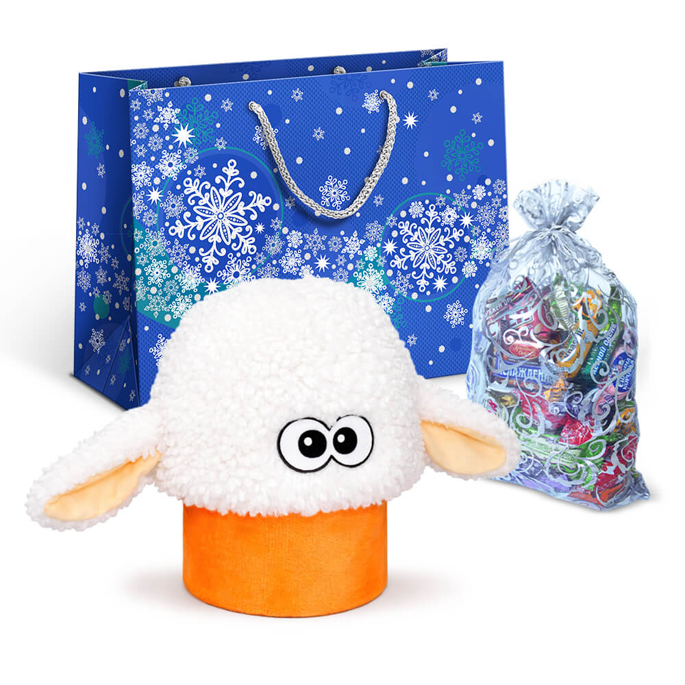 Набор "Барашек Санни" в новогоднем пакете с мягкой шапочкой овечкой и мешочком со сладким подарком 600г Люкс.
