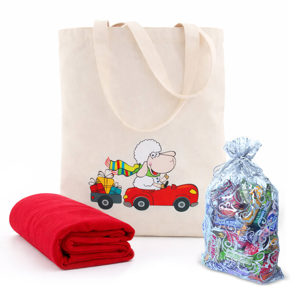 Набор "Праздник" в новогоднем шоппере с мягким пледом и мешочком со сладким подарком 300г Премиум.