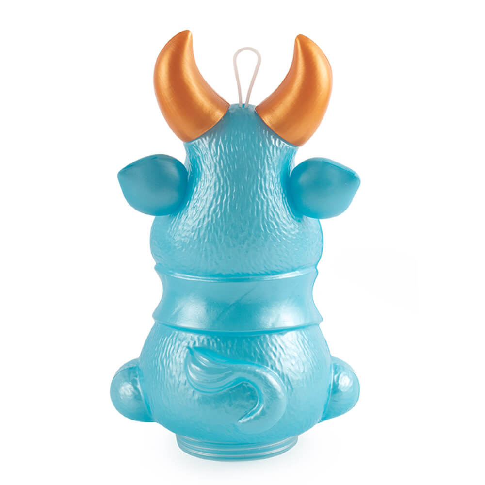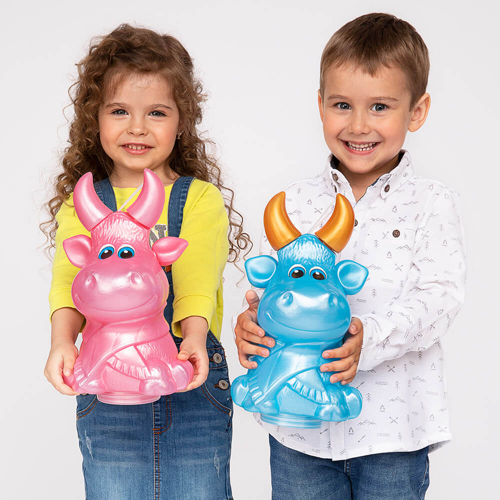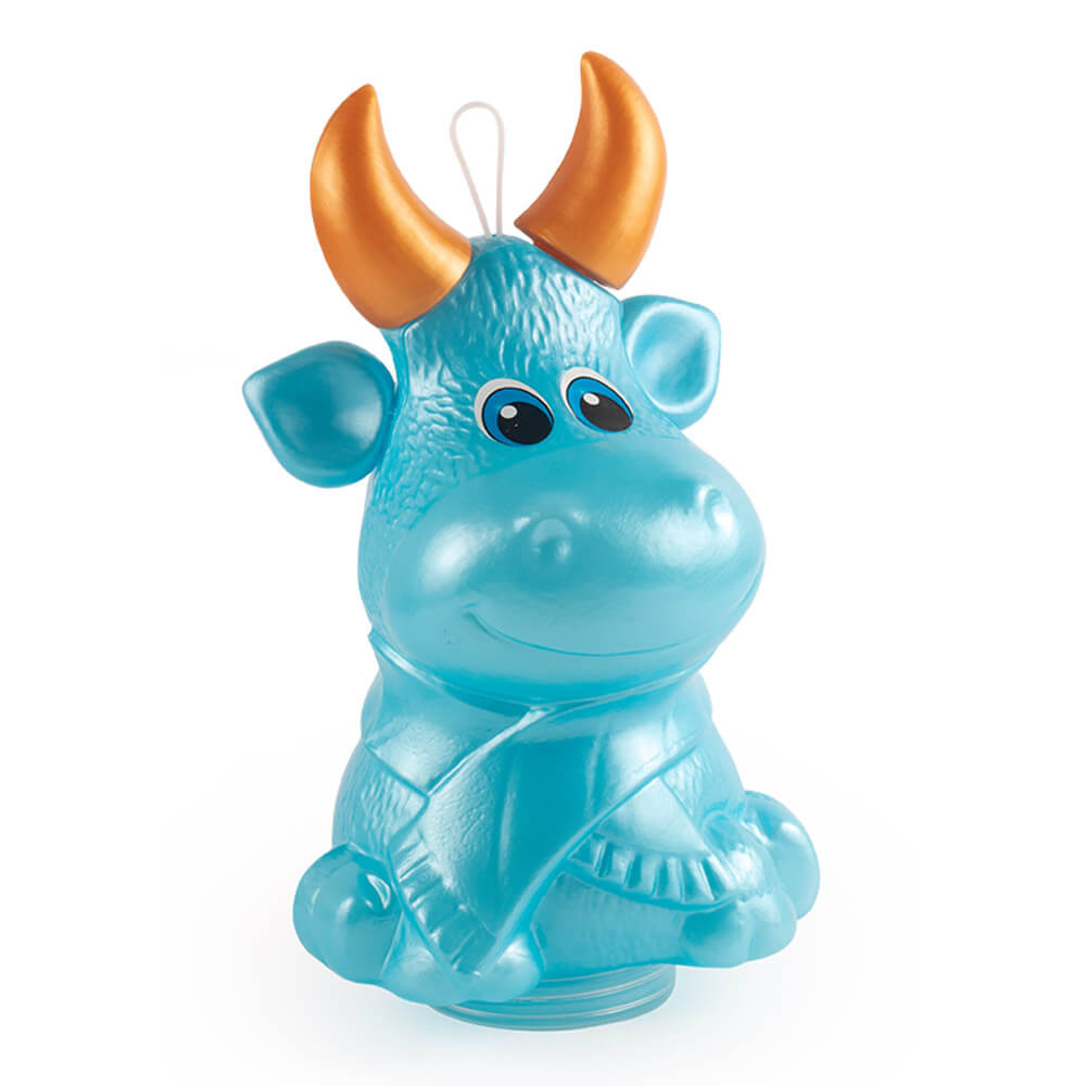 Бычок нежно-голубого цвета сделан из безопасного пластика высшего качества. Сладкий подарок вкладывается в игрушку через донышко с крышкой.